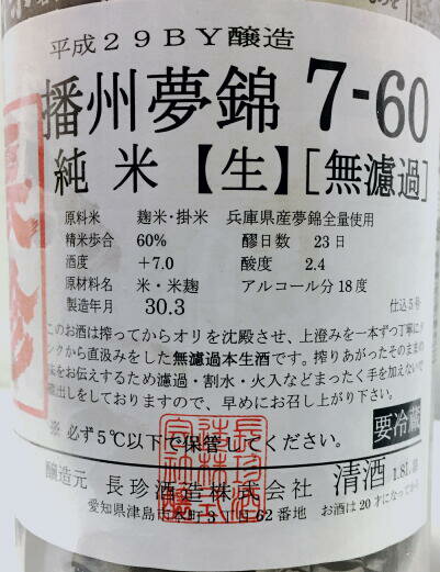 原材料 米・米麹 製造元 長珍酒造株式会社(愛知県) 商品説明 このお酒は、愛知県津島市にある銘醸蔵長珍酒造の兵庫県産夢錦を100%使用した精米歩合60%純米無濾過生原酒です。